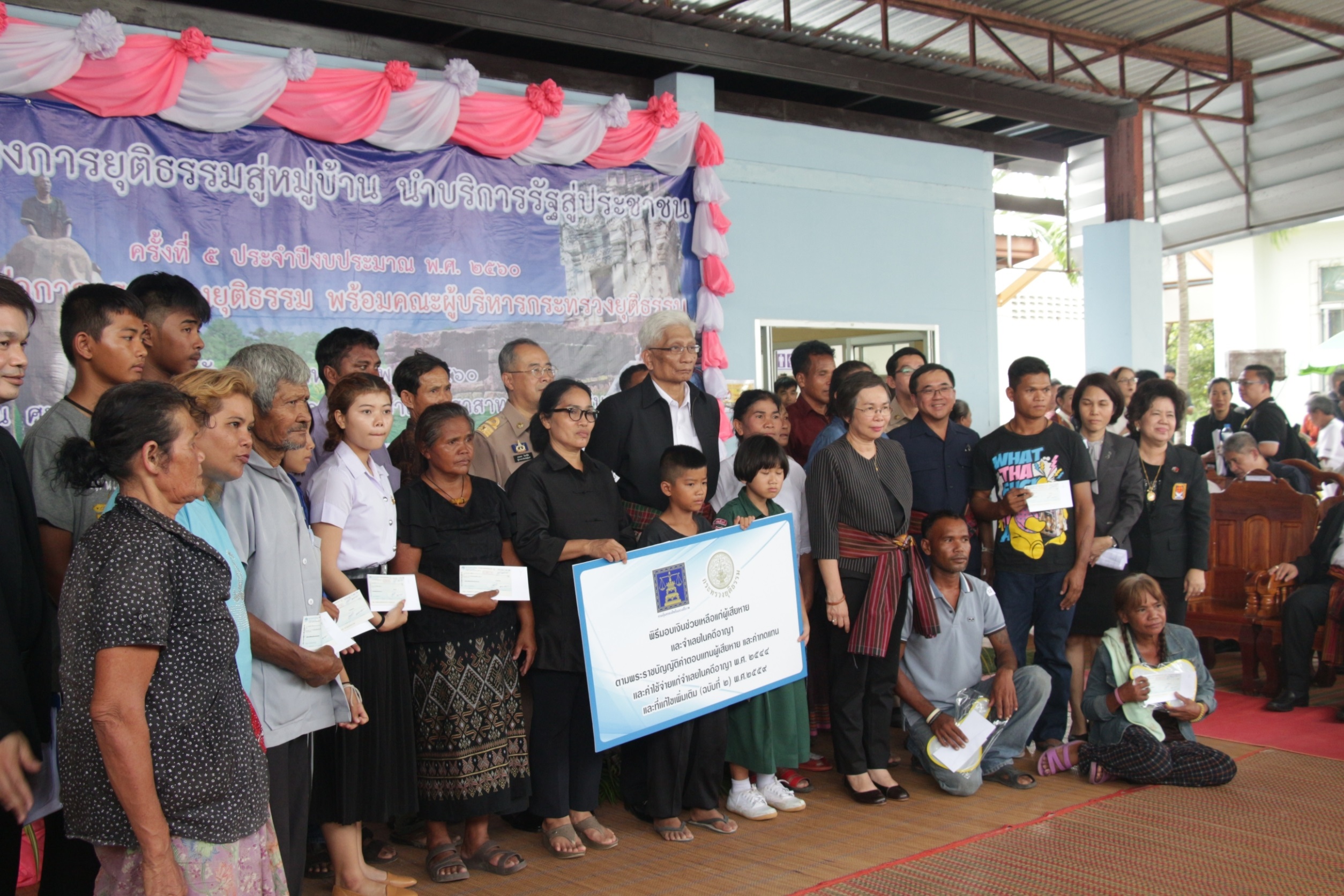 ช่วงบ่าย เวลา 13.30 น. รมว.ยธ. พร้อมคณะผู้บริหาร เดินทางมายังศูนย์ยุติธรรมชุมชนตำบลบ้านไทร อำเภอปราสาท จังหวัดสุรินทร์ โดยมีผู้ว่าราชการจังหวัดสุรินทร์ ผู้นำชุมชนและชาวบ้านระแวกใกล้เคียงมาต้อนรับตามประเพณีท้องถิ่นโดยนำผ้าขาวม้าผูกเอวรับขวัญประมาณ 400 คน หลังจากเสร็จสิ้นพิธีการกล่าวต้อนรับ รมว.ยธ.ได้มอบค่าตอบแทนผู้เสียหายและค่าทดแทนแก่จำเลยในคดีอาญา จำนวน 22 คน พร้อมตรวจเยี่ยมศูนย์ยุติธรรมชุมชนตำบลบ้านไทรและให้กำลังใจเจ้าหน้าที่ ที่มาจัดกิจกรรมนำบริการรัฐสู่ประชาชน ครั้งที่ 5 ของหน่วยงานในสังกัดกระทรวงยุติธรรม ซึ่ง สกธ.ได้นำสมุดภาพอินโฟกราฟิก จำนวน 300 เล่ม สร้างการรับรู้กฎหมายให้ประชาชนและ cd เสียงกฎหมายน่ารู้มอบให้หอกระจายข่าวหมู่บ้าน ศูนย์ยุติธรรมชุมชน เพื่อเป็นสื่อสนับสนุนให้ความรู้กฎหมายกับคนในชุมชนไว้เป็นเกราะป้องกันการเอารัดเอาเปรียบจากผู้ไม่หวังดี