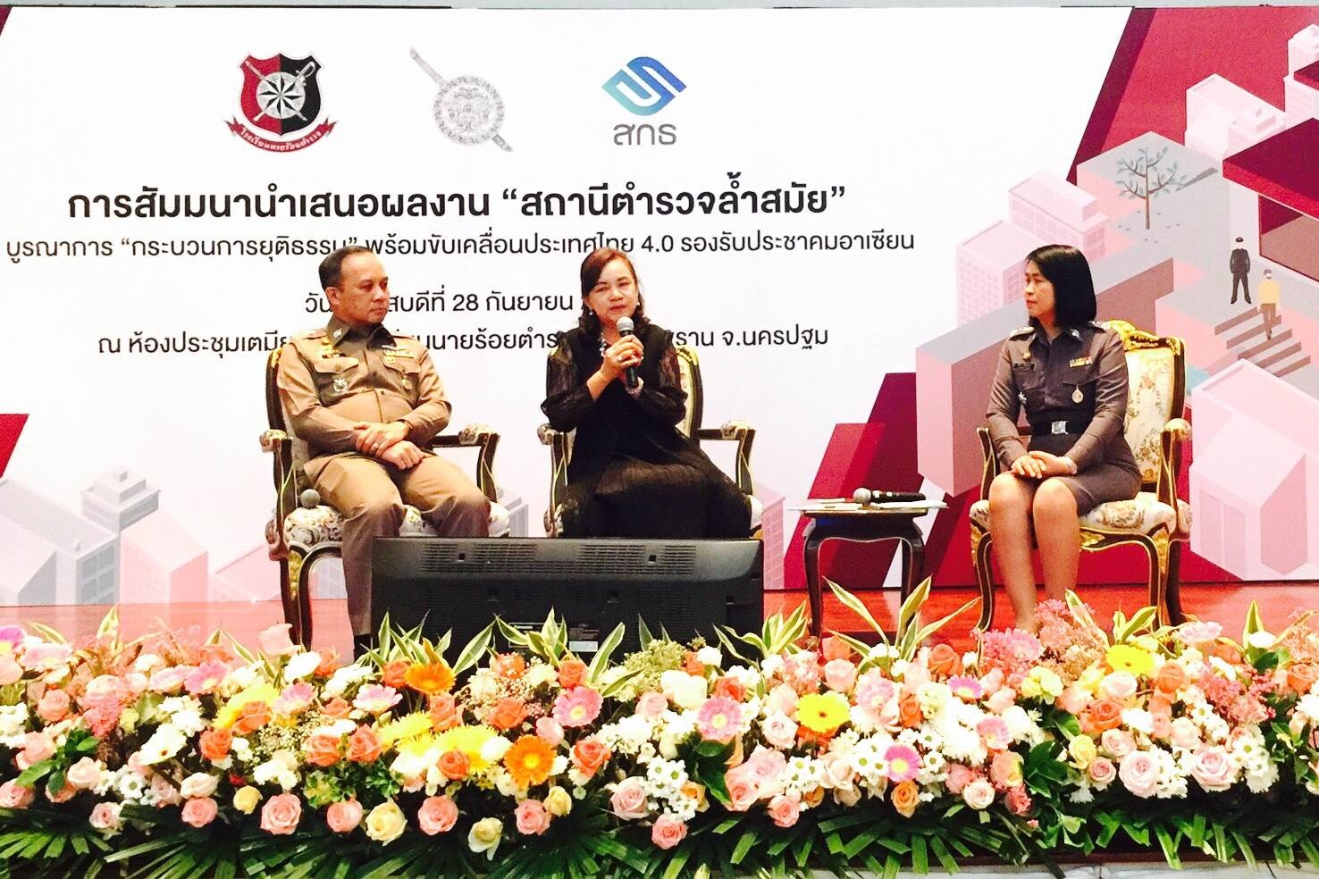 การสัมมนานำเสนอผลงาน “สถานีตำรวจล้ำสมัย” ในวันที่ 28 กันยายน 2560 นางศิวากร คูรัตนเวช รอง ผอ.สกธ. และ นายชาตรี จันทร์เพ็ญ ผอ.สนป. ได้เข้าร่วมการสัมมนานำเสนอผลงานโครงการตำรวจล้ำสมัย ซึ่งเป็นโครงการสำคัญที่ได้รับการจัดสรรจากงบประมาณตามแผนงานบูรณาการปฏิรูปกฎหมายและพัฒนากระบวนการยุติธรรม ในปีงบประมาณ 2560 และสอดคล้องกับยุทธศาสตร์ชาติ แผน 12 แผนแม่บทการบริหารงานยุติธรรมแห่งชาติ ฯ โดยมี พล.ต.อ. รุ่งโรจน์ แสงคร้าม รองผบ.ตร. เป็นประธาน สรุปผลการสัมมนา ได้ดังนี้