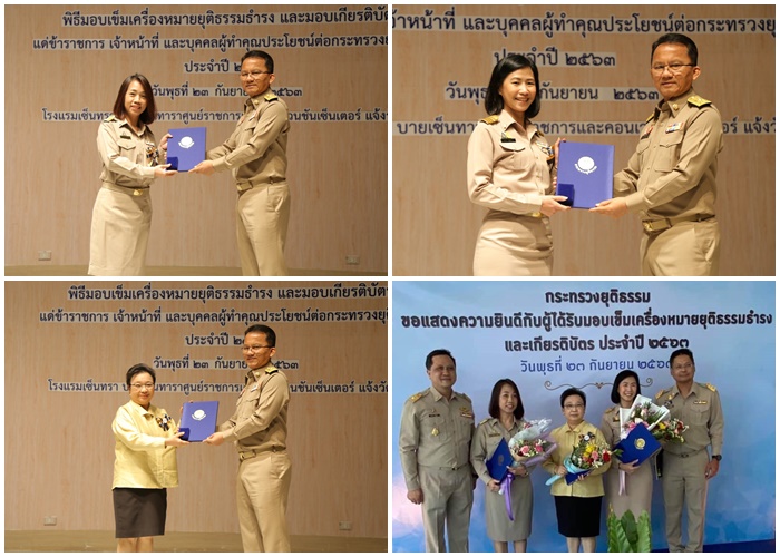 23 กันยายน 2563 เวลา 13.30 น. นายสมศักดิ์ เทพสุทิน รัฐมนตรีว่าการกระทรวงยุติธรรม เป็นประธานในพิธีมอบเข็มเครื่องหมายยุติธรรมธำรง ประจำปี 2563 โดยมี พ.ต.ท.พงษ์ธร ธัญญสิริ ผู้อำนวยการสำนักงานกิจการยุติธรรม เข้าร่วมพิธีดังกล่าว ณ ห้องประชุมออดิทอเรียม อาคารทรงกลม (ชั้น ๒) โรงแรมเซ็นทรา บายเซ็นทารา ศูนย์ราชการและคอนเวนชันเซนเตอร์ แจ้งวัฒนะ กรุงเทพมหานคร สำนักงานกิจการยุติธรรมมีผู้ที่ได้รับการประดับเข็มเครื่องหมายยุติธรรมธำรงและเกียรติบัตร ประจำปี 2563 จำนวน 3 ราย ได้แก่