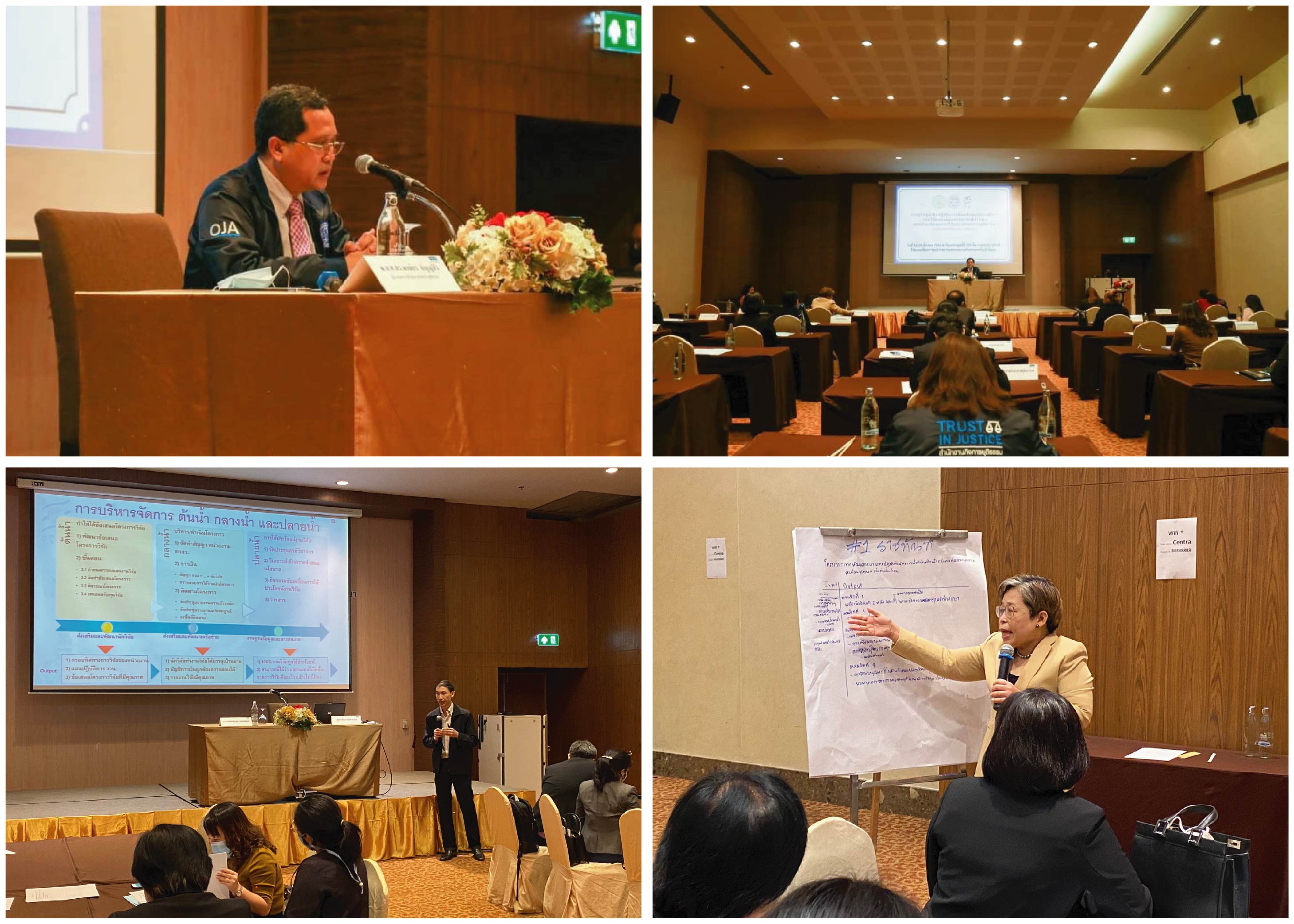 ภายในงานภาคเช้าได้รับเกียรติจาก รศ.สมพร อิศวิลานนท์  และ ดร.ปิยะทัศน์ พาฬอนุรักษ์ จากสถาบันคลังสมองของชาติ เป็นวิทยากรบรรยายในหัวข้อ ทฤษฎีการเปลี่ยนแปลง (Theory of Change)  เพื่อใช้ประกอบการศึกษาบริบทที่เปลี่ยนของไปของการบริหารจัดการงานวิจัย และการฝึกภาคปฏิบัติ การออกแบบเส้นทางสู่ผลกระทบของงานวิจัยด้านกระบวนการยุติธรรม (Impact Pathway)  เพื่อให้มีความสอดคล้องการนำไปใช้ประโยชน์อย่างแท้จริง