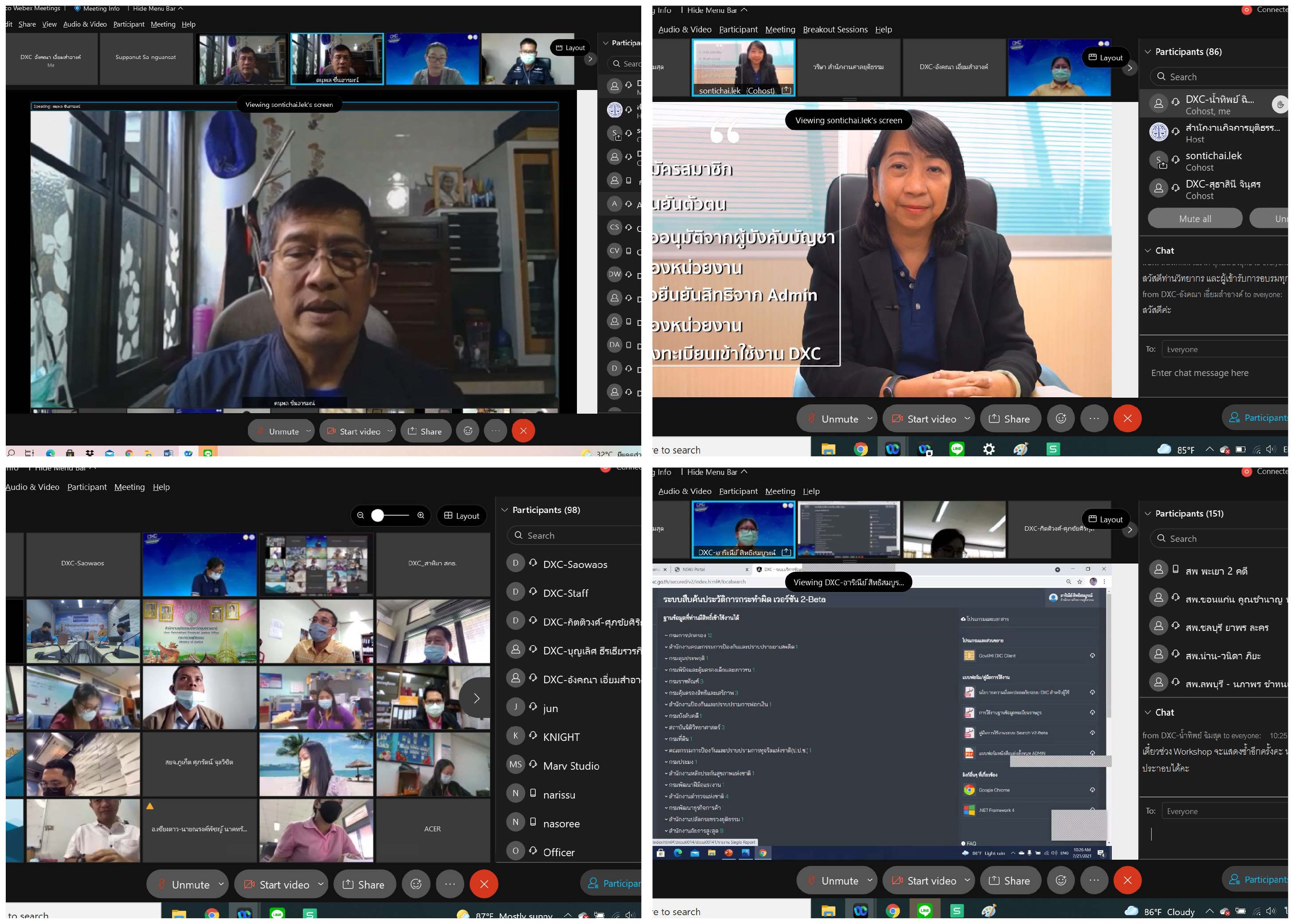 เมื่อวันที่ 20 – 23 กรกฎาคม 2564 ศอช. โดยกลุ่ม IT ได้จัดอบรมการใช้งานระบบ DXC ออนไลน์ ให้กับเจ้าหน้าที่ในเครือข่ายศูนย์แลกเปลี่ยนข้อมูลกระบวนการยุติธรรม (DXC) ด้วยระบบทางไกลผ่านจอภาพ (Webex conference) โดยมีผู้เข้าร่วมการอบรม จำนวน