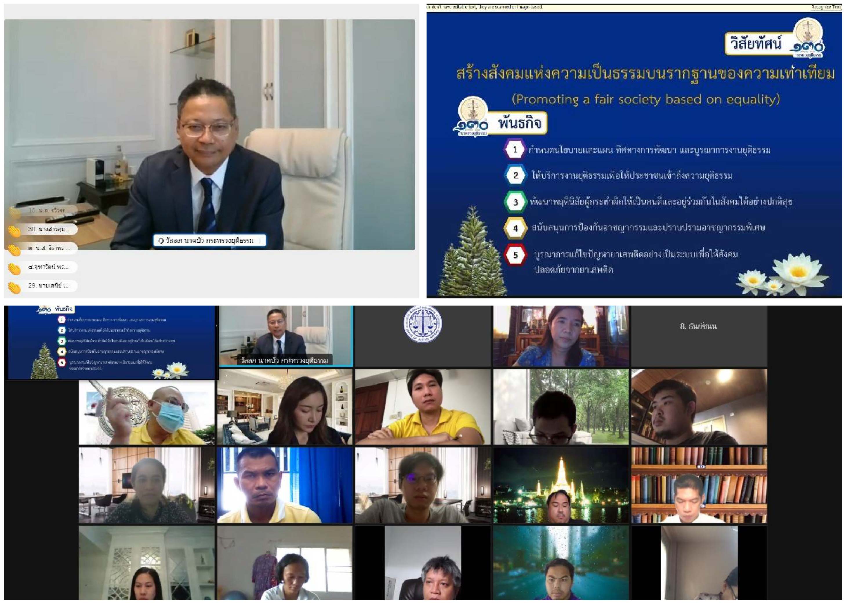 วันที่ 2 สิงหาคม 2564 เวลา 09.00 -12.00 น. สถาบันพัฒนาบุคลากรในกระบวนการยุติธรรม สำนักงานกิจการยุติธรรม ได้รับเกียรติจาก นายวัลลภ นาคบัว รองปลัดกระทรวงยุติธรรม บรรยายในหัวข้อ “บทบาทของกระทรวงยุติธรรมกับการคุ้มครองสิทธิเสรีภาพของประชาชน” ให้ผู้เข้ารับการฝึกอบรมหลักสูตร การพัฒนาศักยภาพนักวิจัยในกระบวนการยุติธรรม รุ่นที่ 5 (ศวธ.5) ในประเด็น พันธกิจและ บทบาทของกระทรวงยุติธรรมกับการคุ้มครองสิทธิเสรีภาพของประชาชนทั้งทางแพ่ง ทางอาญา