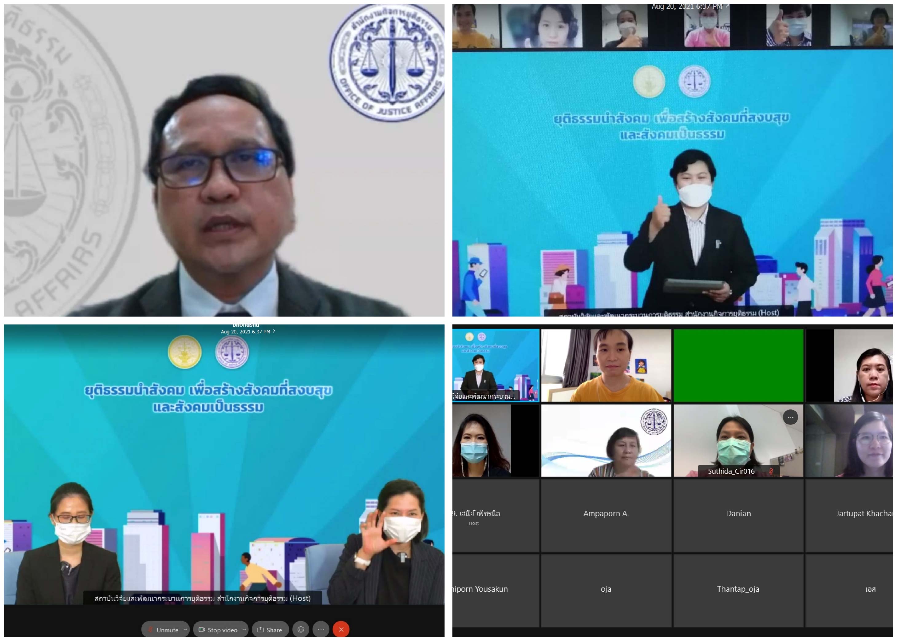 วันที่ 20 สิงหาคม 2564 เวลา 09.00 น. พ.ต.ท.พงษ์ธร ธัญญสิริ ผู้อำนวยการสำนักงานกิจการยุติธรรม ได้ให้เกียรติเป็นประธานและกล่าวเปิดงาน “การถ่ายทอดองค์ความรู้งานวิจัยและนวัตกรรมของกระทรวงยุติธรรม ประจำปี 2564” ผ่านระบบ Cisco Webex meeting โดยมีผู้บริหาร เจ้าหน้าที่ สกธ. และ เครือข่ายวิจัย ยธ. เข้าร่วมงานดังกล่าว โดยกิจกรรมการถ่ายทอดองค์ความรู้ฯ ได้รับเกียรติจากวิทยากรที่มีความรู้ความเชี่ยวชาญด้านการวิจัยกฎหมายในหน่วยงานในกระทรวงยุติธรรม และสถาบันการศึกษามาร่วมถ่ายทอดองค์ความรู้ฯ ใน 4 หัวข้อที่น่าสนใจ และการนำเสนอผลงานวิจัยของสถาบันนิติวิทยาศาสตร์ จำนวน 4 เรื่อง ดังนี้