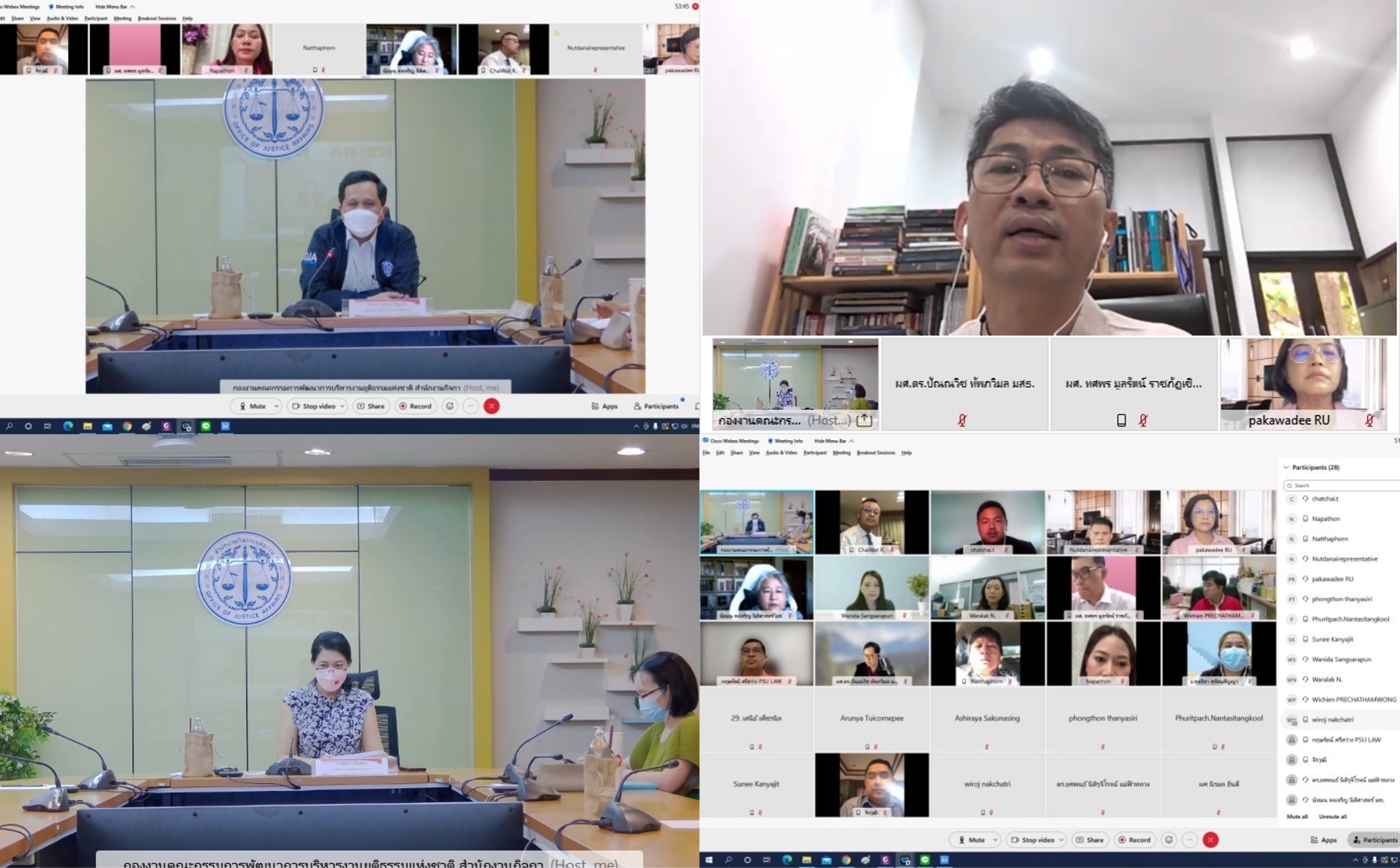 วันที่ 30 ธันวาคม 2564 เวลา 10.00- 12.00 น. การประชุมเพื่อพิจารณา (ร่าง) กรอบการวิจัยเพื่อพัฒนากระบวนการยุติธรรม พ.ศ. 2566 – 2569 และหารือแนวทางการประสานความร่วมมือ โดยวิธีการประชุมทางไกล (Video Conference)ผ่านระบบ Cisco Webex Meeting พันตำรวจโท พงษ์ธร ธัญญสิริ ผู้อำนวยการสำนักงานกิจการยุติธรรม เป็นประธานในพิธีเปิดการประชุมฯพร้อมด้วยนายชัยวัฒน์ ร่างเล็ก รองผู้อำนวยการสำนักงานกิจการยุติธรรม และนางขัตติยา รัตนดิลก ผู้อำนวยการสถาบันวิจัยและพัฒนากระบวนการยุติธรรม โดยมีผู้เข้าร่วมประชุม ประกอบด้วยผู้แทนจากสถาบันการศึกษาต่าง ๆ และเครือข่ายวิชาการด้านนิติศาสตร์ เข้าร่วมประชุม โดยที่ประชุมได้ร่วมกันพิจารณาและให้ข้อเสนอแนะเพื่อเติม ต่อ (ร่าง) กรอบการวิจัยเพื่อพัฒนากระบวนการยุติธรรม พ.ศ. 2566 -2569 ซึ่งประกอบด้วย 5 กรอบการวิจัย ดังนี้